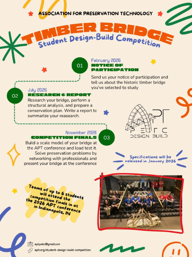 Join us for an exciting session introducing the 2026 APT PETC Student Design-Build Competition—the 11th year of inspiring innovation and collaboration! This year’s challenge focuses on Timber Bridge Specifications, and we’re eager to see a strong turnout from schools across the country.